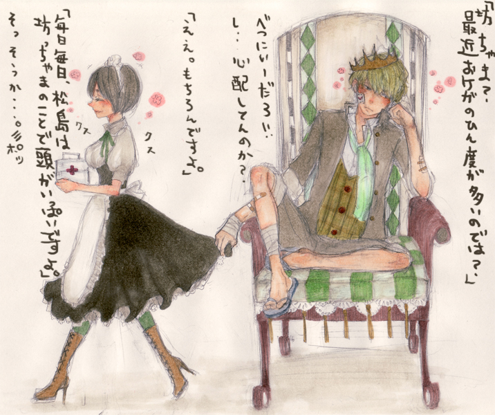 ちなみに喧嘩でおった傷ではなく(ケンカ怖い)、王様がムカつくので門からでず、毎朝塀を無理矢理登って、落ちて怪我しているのである(ちゃんとspが見守っている)…。