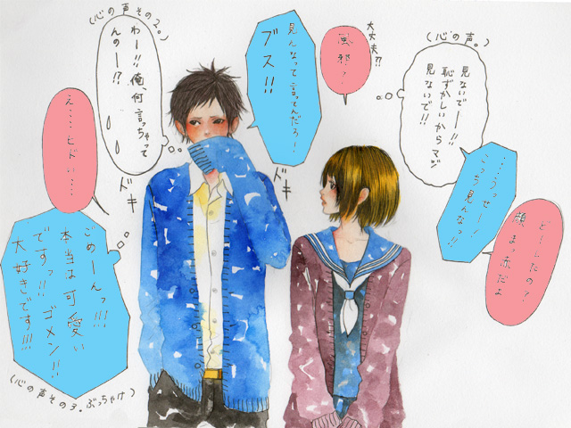 描いてるこっちが恥ずかしくなってきたわ! あ、吹き出しの色つける場所間違えた・・・。